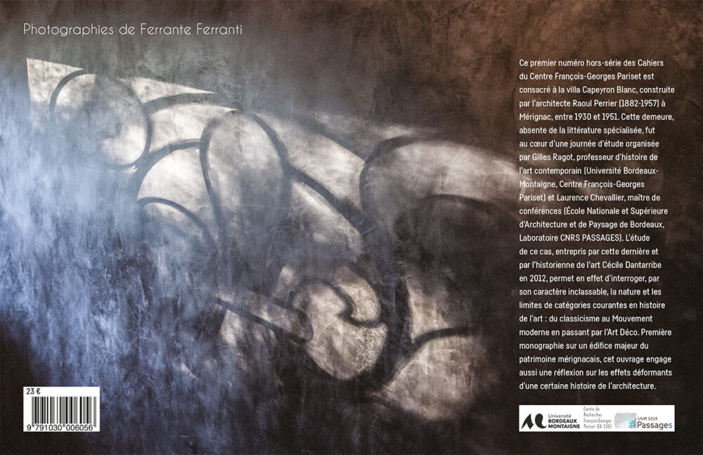 Ce premier numéro hors-série des Cahiers du Centre François-Georges Pariset est consacré à la villa Capeyron Blanc, construite par l’architecte Raoul Perrier (1882-1957) à Mérignac, entre 1930 et 1951. Cette demeure, absente de la littérature spécialisée, fut au cœur d’une journée d’étude organisée par Gilles Ragot, professeur d’histoire de l’art contemporain (Université Bordeaux Montaigne, Centre François-Georges Pariset) et Laurence Chevallier, maître de conférences (École Nationale et Supérieure d’Architecture et de Paysage de Bordeaux, Laboratoire CNRS PASSAGES). L’étude de ce cas, entrepris par cette dernière et par l’historienne de l’art Cécile Dantarribe en 2012, permet en effet d’interroger, par son caractère inclassable, la nature et les limites de catégories courantes en histoire de l’art : du classicisme au Mouvement moderne en passant par l’Art Déco. Première monographie sur un édifice majeur du patrimoine mérignacais, cet ouvrage engage aussi une réflexion sur les effets déformants d’une certaine histoire de l’architecture.